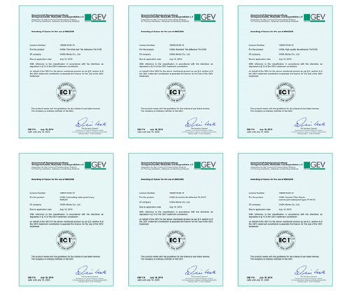 此次獲得認(rèn)證的六大產(chǎn)品包括通用強(qiáng)效型瓷磚膠TA-S100、經(jīng)濟(jì)型瓷磚膠TA-S101、重磚型瓷磚TA-S106、隨意貼瓷磚膠TA-S109、瓷磚填縫劑(窄縫防水型)TF-M101、快硬防水漿料WM-201并全部取得EC1plus等級。