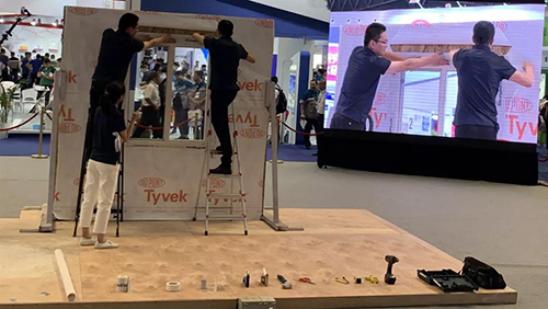 在現(xiàn)場進行的Tyvek?特衛(wèi)強防水透汽膜施工演示是防水展中六場大型施工演示第一場,吸引了不少人的目光。