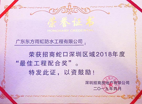 4月19日,“共筑大灣區(qū),精誠贏未來——2019年招商蛇口深圳區(qū)域供應(yīng)商大會”在深圳召開。東方雨虹憑借優(yōu)質(zhì)產(chǎn)品及高效服務(wù)榮獲招商蛇口深圳區(qū)域2018年度“最佳工程配合獎(jiǎng)”。