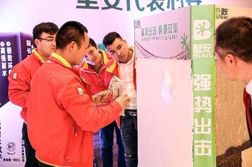 民建公司高級(jí)產(chǎn)品經(jīng)理潘佳對(duì)壁安全品類(lèi)產(chǎn)品做詳細(xì)介紹。大會(huì)共發(fā)布壁安產(chǎn)品21種,涵蓋瓷磚膠、膩?zhàn)臃邸⒔缑鎰⒍侣殹⑻羁p劑、防水等品類(lèi)。為更好地展示產(chǎn)品性能,合肥當(dāng)?shù)刂吖ざ艓煾岛鸵庀蚩蛻衄F(xiàn)場(chǎng)對(duì)部分產(chǎn)品進(jìn)行試刷,并邀請(qǐng)與會(huì)嘉賓上臺(tái)感受產(chǎn)品的施工體驗(yàn)。