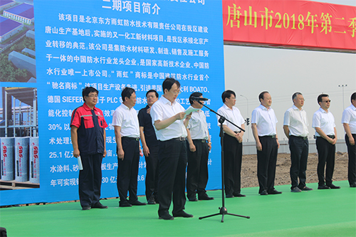 6月30日上午9點,由唐山市市委市政府組織召開的”唐山市2018年第二季度重點項目集中開工活動”在唐山東方雨虹二廠項目地隆重舉行,儀式由唐山市常務副市長胡國輝主持。河北省委常委、唐山市委書記王浩、市長丁繡峰、副市長梁振江、豐南區(qū)區(qū)委書記艾春、區(qū)長郝志軍等,以及市區(qū)四大領導班子、市、縣、區(qū)、鎮(zhèn)各有關單位主要負責人近百人參加了開工儀式。