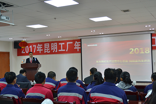 陸殿富先生作重要講話,他首先肯定了昆明生產基地在過去一年的變化與成長,隨后他要求生產基地全體人員要加強學習,夯實各崗位的本領,2018年昆明生產基地肩負重任,要從"產品質量、成本管控、創新與成果"等方面進行全面部署,希望生產基地全體員工腳踏實地,努力進取,在2018年實現全面超越自我。