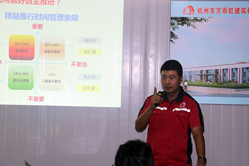 9月1日至9月27日,東方雨虹杭州建德生產(chǎn)基地組織一線生產(chǎn)員工進(jìn)行開工前集訓(xùn)。 培訓(xùn)學(xué)習(xí)的主要內(nèi)容有精益生產(chǎn)管理、防水卷材產(chǎn)品知識介紹、卷材生產(chǎn)過程控制、卷材生產(chǎn)設(shè)備現(xiàn)場管理及安全生產(chǎn)管理四大部分。此外還有防水卷材檢測知識相關(guān)培訓(xùn)和車間班組建設(shè)與管理等專項課程。