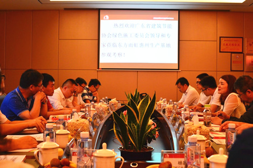 6月16日,廣東省建筑節(jié)能協(xié)會(huì)副秘書(shū)長(zhǎng)包守權(quán)、中建三局(粵)總工程師吳延宏、上海建工廣州公司總工程師薛曉勇、上海建工深圳公司總工程師李子旭、中建八局(粵)副總工程師王四久等一行考察東方雨虹惠州生產(chǎn)基地。