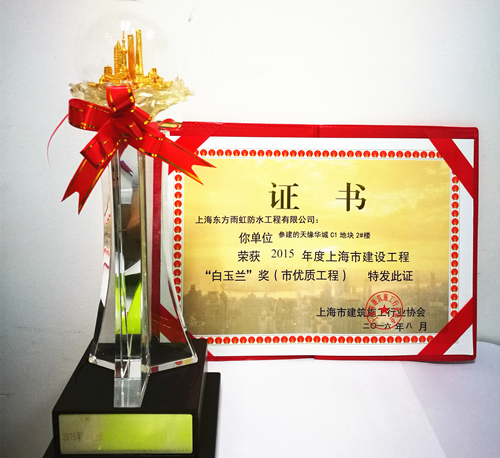 8月,上海東方雨虹參建的天緣華城C1地塊1#樓、2#樓榮獲2015年度上海市建設工程“白玉蘭”獎(市優質工程)榮譽稱號。 上海市建設工程“白玉蘭”獎是由上海市建筑施工行業協會頒發,旨在促進上海建筑業誠信建設,提升上海市建設工程質量水平,提高企業市場競爭力和品牌影響力,同時也培養了一批批能工巧匠和優秀項目管理人才,錘煉了一支支素質優良的施工隊伍,推動了上海建筑業的健康發展。 2010年至今,上海東方雨虹參建的白玉蘭項目已達40余個,此次獲獎的天緣華城項目位于上海市祁連山路,上大板塊,地理位置優越,是由大華集團投資建設。上海東方雨虹作為大華集團防水供應商,已與大華集團合作十余年之久。此項殊榮不僅使上海東方雨虹區域品牌形象得到進一步提升,擴大了公司在華東市場的影響力,更是雙方合作共贏的體現,為雙方更深入的合作奠定了堅實的基礎。 上海東方雨虹自成立以來,一直踐行“為人類為社會創造持久安全的環境”的企業使命,致力于“讓老百姓住上不漏水的房子”。東方雨虹不僅專注高品質的產品,更專注于為客戶提供系統服務,成為集產品、技術、服務和解決方案為一體的全球化防水系統服務商。在產品質量、施工質量、服務質量管控方面始終高標準、嚴要求,堅持精益求精,著力打造質量優質工程項目。