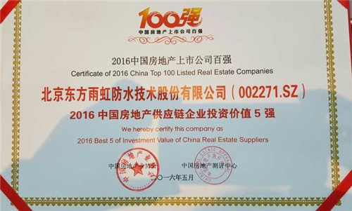 東方雨虹獲評“2016中國房地產供應鏈上市公司投資價值5強”