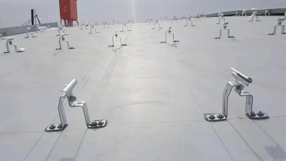 該項目屋面防水等級為一級,在屋面圍護(hù)系統(tǒng)中,指廊部分采用1.5mm織物內(nèi)增強(qiáng)型TPO防水卷材設(shè)置于鍍鋅鋼板與巖面保溫層間,通過鍍鋅鋼支座機(jī)械固定于幾字形檁條,搭接邊采用熱風(fēng)焊接工藝。核心區(qū)與指廊區(qū)采光帶間、采光帶與屋面間通過天溝進(jìn)行分隔,天溝部分采用2.0mm織物內(nèi)增強(qiáng)型TPO防水卷材,防水層采用底部無穿孔固定+天溝側(cè)壁滿粘的工法,防水層完成后卷材直接外露使用。
