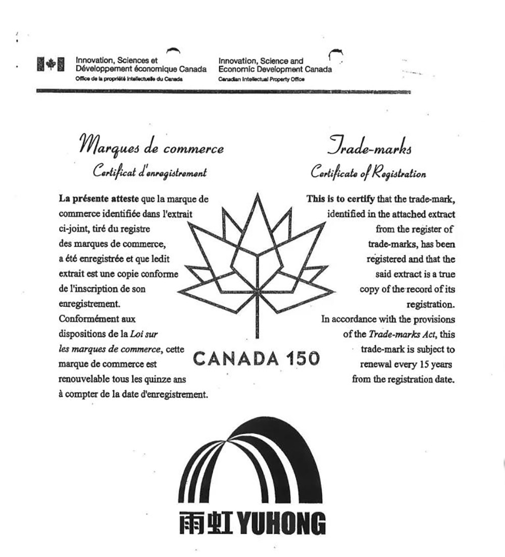 該商標(biāo)自2012年在加拿大申請布局,歷時八年,終獲證書,為“世界的東方雨虹”品牌之路保駕護(hù)航。