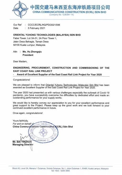 日前,東方雨虹(ORIENTAL YUHONG)喜獲2020年中國交建馬來西亞東海岸鐵路項(xiàng)目總經(jīng)理部年度優(yōu)秀供應(yīng)商稱號。
