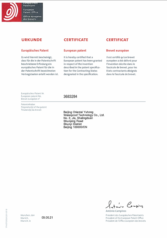 近日,東方雨虹獲得由歐洲專利局(EPO)頒發(fā)的歐洲發(fā)明專利授權(quán)證書(專利號(hào)EP3683284)。該專利是東方雨虹HDPE產(chǎn)品研發(fā)過程中產(chǎn)生的核心成果之一。