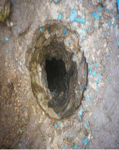 在拆除開挖的屋面上發(fā)現(xiàn),粘貼時采用的是濕鋪法工藝(即用素水泥漿粘貼工藝),卷材搭接不可靠,施工工藝不規(guī)范等,屋面雨水通過質(zhì)量缺陷部位滲漏至底部,防水層與屋面結(jié)構(gòu)板之間的泡沫混凝土構(gòu)造體系內(nèi)存在松散多孔空間,滲漏水能夠在構(gòu)造層內(nèi)大量集聚、蔓延擴散,造成大面擴散性滲漏水(竄水現(xiàn)象)。